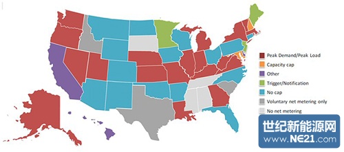 各州的净计量电价制度上限值的定义。用红色表示的州利用峰值需求计算上限值。(图:国家可再生能源实验室)