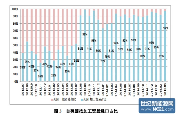 二、3 月份自美国进口多晶硅 1572 吨,环比增加 8.0%,但其中按照加工贸易方式进口量达 1530 吨,占当月从美国进口总量的 97.3%,几乎全部通过加工贸易方式进入国内。自美国按加工贸易方式进口占绝对主导地位的现象始于2013 年 7 月“双反”立案后的 8 月份,之后加工贸易规避“双反”的策略一直屡试不爽,从不间断,因此从美国加工贸易进口一直占绝对主导地位是导致总进口量居高不下的另一重要因素。