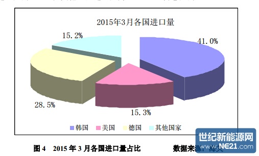 据 3 月份分国别进口数据显示,自韩国、美国、德国三国共进口多晶硅 8733吨,占总进口量的 84.8%,其中从韩国进口量为 4224 吨,占总进口量的 41.0%;
