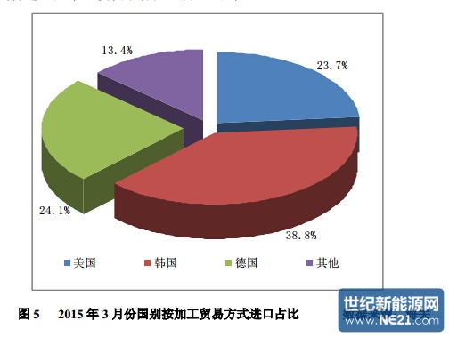 进口总量的 97.3%,一季度累计自美国按加工贸易进口占比为 95.7%,其余从一般贸易渠道进口的为不受“双反”影响的半导体多晶硅;3 月份自德国按加工贸易方式进口多晶硅 1554 吨,占自德国进口总量的 52.9%,一季度累计自德国按加工贸易进口占比为 46.3%。虽然自韩国按加工贸易方式进口占比相对美国和德国都低,但由于其总进口绝对量大,故自韩国通过加工贸易方式进口量 2505吨在总加工贸易量中占比也是最大,达到 38.8%,接近四成的加工贸易进口量来自韩国。美国虽然总进口量相比韩国和德国低,但加工贸易进口绝对量在总加工贸易进口量中也仅次于韩国,占比达到 24.1%。