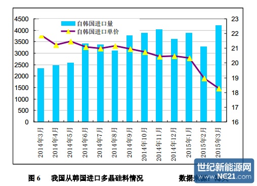 2015 年 3 月份从韩国进口多晶硅量增加至 4224 吨,环比增幅为 28.5%;3月份进口单价小幅下滑至 18.27 美元/千克,环比降幅为 3.6%。