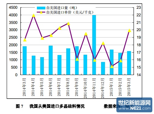 2015 年 3 月份从美国进口多晶硅量增加至 1572 吨,环比增幅为 8.0%;3月份进口单价微幅上调至 19.94 美元/千克,环比涨幅为 25.4%。