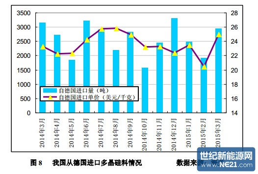 图 8 我国从德国进口多晶硅料情况 数据来源:海关