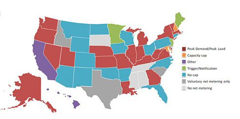 净计量电价制度是由州的法律和州的公益事业委员会规定的。在各州售电的电力公司必须遵守该制度。由于是州主导的,因此各州的可并网系统规模、剩余电力的处理方法及剩余电力的收购价格等大不相同。当然,装机容量的上限值和上限的确定方法也各不相同。有些州设定的上限值与州的可再生能源导入目标相同。