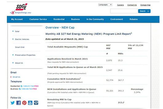 三家电力公司中,预计为南加利福尼亚和圣地亚哥地区提供服务的美国SDG&E公司将最早达到上限。在SDG&E的管辖内,在2015年3月31日已达到3.24%。