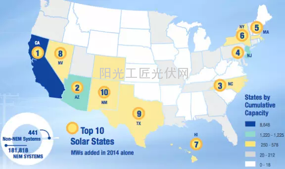 迄今为止,加州、亚利桑那以及新泽西这三个州,一直是美国光伏行业的领导者,而近几年,北卡罗莱纳,夏威夷,马萨诸塞和科罗拉多等州也成为光伏业迅猛发展的地区。甚至在一些不太看好的地区,如蒙大拿州,也开始有光伏发电部署,该州Big Horn郡电力联合体,累积人均光伏瓦特数达到最高的水平。