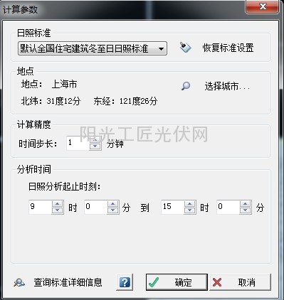 日照标准我们选择全国住宅建筑冬至日日照标准,地点可以选择你需要的城市,也可以在里面添加你需要的地点的经纬度自己新建,这里我们选择了上海市。计算精度的时间步长默认选择了1分钟,分析时间一般是冬至日的上午9点起至下午3点为止,当然你有特殊需求也可以自己调整。设置完成后点击确定即可。