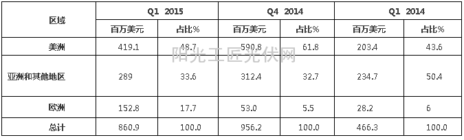 第一季度,阿特斯全球各区域市场销售收入占公司总销售额比重分别为:美洲48.7%,亚洲和其他地区33.6%,欧洲17.7%。2014年第四季度占比为:美洲61.8%,亚洲和其他地区32.7%,欧洲5.5%。2014年第一季度,美洲43.6%,亚洲和其他地区50.4%,欧洲6.0%(下表):