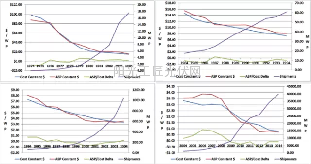 图1显示了1974-2014年间,光伏组件成本,价格,出货量以及平均售价/成本变化。