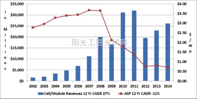 图2:光伏电池/组件平均售价和收入,2002-2014