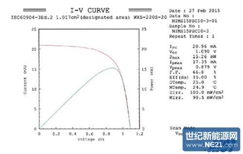 产业技术综合研究所光伏发电研究中心评估及标准小组测量的钙钛矿太阳能电池的电流-电压特性(出处:日本物质材料研究机构)索比光伏网 https://news.solarbe.com/201505/12/190995.html