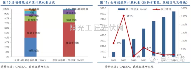 物理储能、电磁储能、电化学储能三点爆发,电化学储能增长最为迅猛。目前,全球储能设备技术主要包含物理储能、电磁储能、电化学储能三方面。根据中关村储能产业技术联盟的(CNESA)的数据显示,2009年以后全球储能市场进入快速发展期,电化学技术增长迅猛,2000-2014年其复合增长率达到135%。10-14年间,国际市场上钠硫电池及锂电池14年累计装机容量之和占到75%,而中国市场主要以锂电池为主,14年装机容量占比72%(排除抽水蓄能、压缩空气储能及储热)。