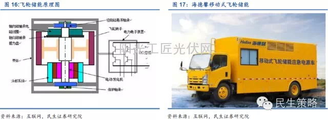 飞轮转动将电能转化为动能存储。飞轮储能主要指利用电动机带动飞轮旋转将过剩电能以动能的形式储存起来,在高峰发电期又通过飞轮带动发电机发电。主要结构为飞轮,以及支撑飞轮的轴承系统,和作为电动机和发电机的内置电机。整个飞轮储能的运作系统是完全的机械运动,没有任何化学反应的参与,其优点是大容量,几乎不需要维护,设备使用寿命长,但其缺陷主要为能量密度较低,停止充电时自放电率较高。