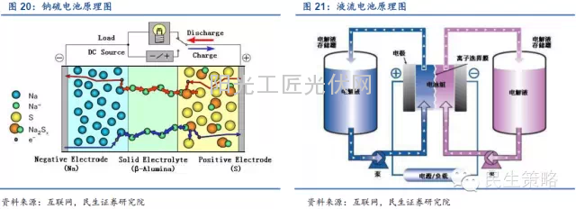 正负电极各自循环储能。液流电池是利用正负极电解液分开各自循环的一种新型的大型储能装置,正负极使用全钒盐溶液为钒电池。其优势主要为大容量、环保、使用寿命长,应用前景主要为备用电源及电网企业的削峰填谷。其劣势主要在于能量密度较低,体积大,成本高。