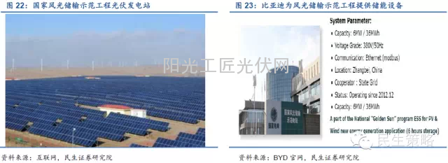 国家风光储输示范工程属于国家金太阳重点项目之一,由国家电网自主设计,建造,世界上规模最大,实现了风光互补、储能调节、智能调度的新能源项目。该项目选址河北省张北县,主要看中了其丰富的风能及光能资源。工程总投资150亿元,一期建成风电10万千瓦、光伏发电4万千瓦、储能2万千瓦,已于11年12月建成发电。比亚迪为一期工程提供了36MWh的储能电池,实现了风电利用率提高5%-10%。目前二期工程已全面完成,转入运行调试阶段。国家风光储输示范工程由国家牵头,实现了大规模储能技术的突破,由传统的单向输出转为双向储能,为集中式新能源发电利用效率提高树立了标杆。