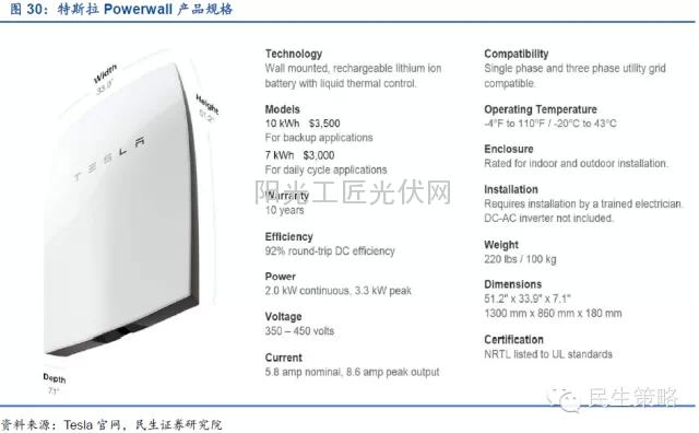 15年5月1日,特斯拉发布特斯拉能源(TeslaEnergy)系列产品,包括家庭用,商用,公用事业用三种解决方案。家用储能系统产品为Powerwall,产品规格有10kWh备用电源型号和7kWh日常供电型号,价格分别在$3500和$3000。通过多个Powerwall的拼接,10kWh型号可实现上限90kWh的储能,7kWh型号可实现最大63kWh的储能。其采取屋顶太阳能板及接入普通电网两种充电方式,实现了居民用电的转移负荷,节省电费开支;存储过剩太阳能自用,避免以较低价格卖给电网企业;断电时提供电力保障。除此之外,特斯拉已在内华达里诺附近建立了超级电池工厂,以降低其汽车电池和储能电池制造成本,充分显现了公司进军能源服务业的决心。此次产品发布不仅是特斯拉转型的重要举措,更刺激了全球储能产业的发展。