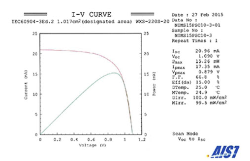 NIMS的研发小组通过改良发电层使用的钙钛矿的涂布方法,控制了表面的凹凸,提高了转换效率及其再现性。另外,电荷(载流子)输送层的材料以前吸湿性较高,会很快导致转换效率降低,因此新开发了吸湿性低、载流子迁移率高的材料,成功改善了稳定性。基于这些成果,将太阳能电池单元的面积扩大到了1cm见方以上,并通过改良元件的制作方法,使钙钛矿太阳能电池全球首次在国际标准测试机构(产业技术综合研究所光伏发电研究中心评估标准小组)实现了15%的公认转换效率。