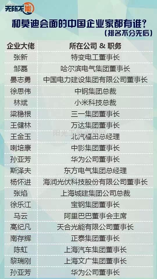 可见名单中民营企业大佬最多,据某位参会老总透露,他们都表示出对印度投资的积极性,更多的是想投资太阳能产业。在这不算长的企业名单中有7家能源企业,其中有三家光伏企业和两家电力企业。这回能源企业大佬与印度总理的亲密接触还擦出了什么火花?至少能源企业达成了一个共识,就是印度市场将是一块大肥肉,看看他们在会议上都说了啥?