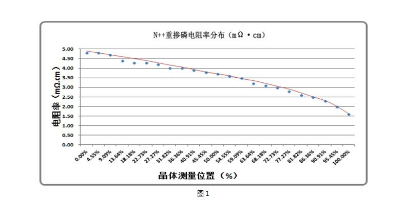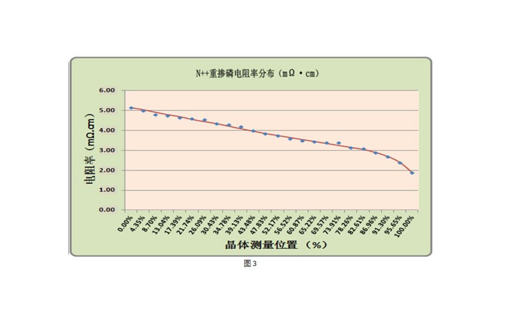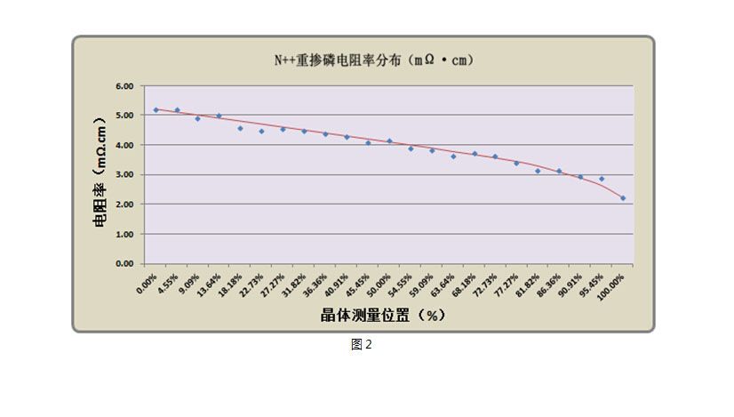 由下图数据表明,掺杂实验非常成功,拉制工艺非常合理,因此我们获得了轴向电阻率分布合理的N++重掺磷硅单晶。