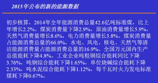 最新的数据显示(如下图),2014年全年消费总量42.6亿吨标准煤,超出了原来设计的40亿吨总量,虽然我们的能源消耗总量上升,但是煤炭的比例在下降,水电、风电、核电等清洁能源的消费总量也在上升,这说明国家在能源结构调整等方面都采取了积极地措施,能源结构进一步清洁化。