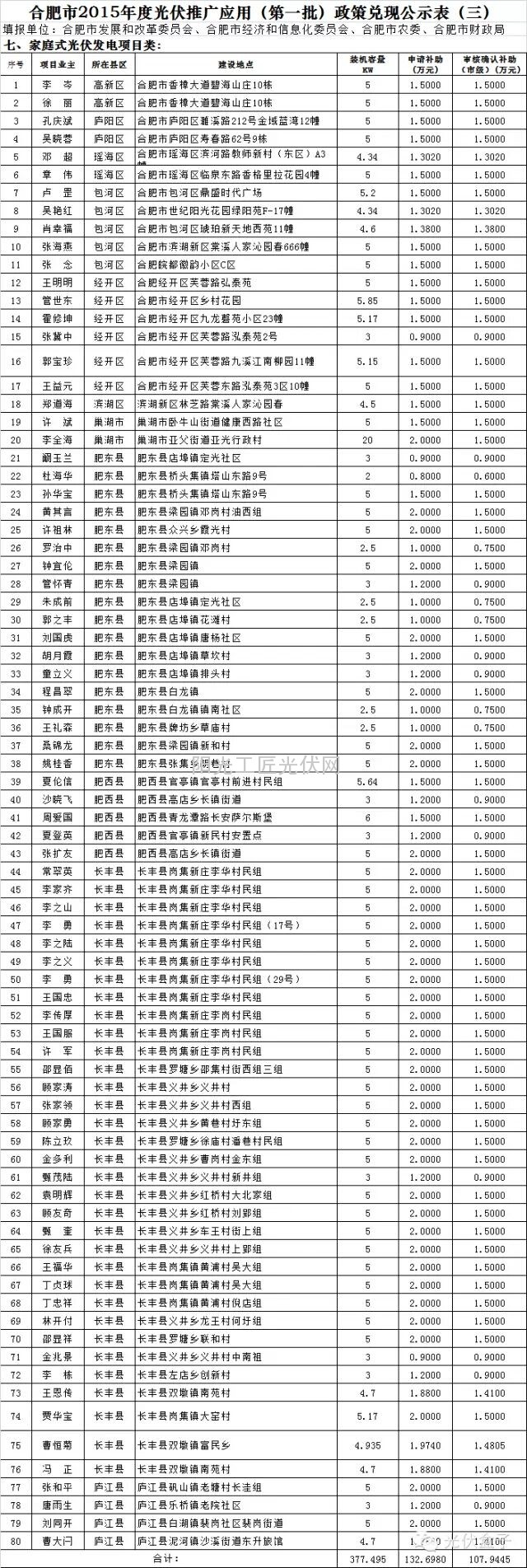2015年合肥市第一批共80户居民领到108万元光伏安装补贴(附详细清单)