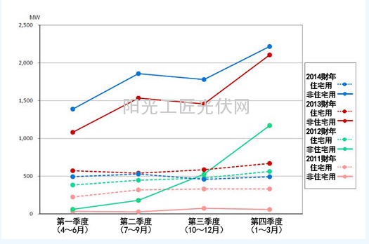 2014财年住宅领域和非住宅领域的日本出货量分别为1.97GW和7.24GW。上财年这两个领域的出货量分别为2.36GW和6.17GW,因此住宅领域虽减少了16.5%,但非住宅领域增加了17.3%。可知非住宅领域的增长推动了整体的增长。住宅领域的出货量减少,有随着消费税的上涨,住宅的开工建设数量减少等原因。