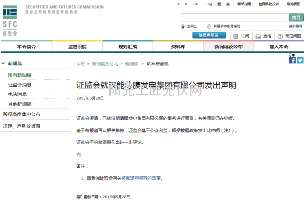 证监会就汉能薄膜发电集团有限公司发出声明 2015年5月28日