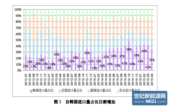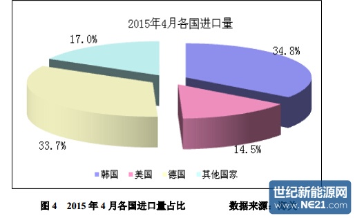3-4 月份自美国进口均价有所回升,主要原因是突击签订的低价加工贸易订单逐渐执行完毕,则高价长单的占比有所增加,导致从美国进口多晶硅均价回升。但 4 月份整体进口价格仍低于 2014 年全年均价和 2015 前四个月均价,可以看到自韩国进口多晶硅的低价倾销对整体进口价格的连带和对国内多晶硅现货价格的压制,因此重新审视对韩国多晶硅的反倾销征税并予以更正显得尤为重要!