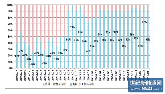 二、4 月份自美国进口多晶硅 1584 吨,环比增加 7.6%,但其中按照加工贸易方式进口量达 1445 吨,占当月从美国进口总量的 91.2%。虽然对美国多晶硅企业的征税都在 50%以上,但基本都以加工贸易渠道规避“双反”征税,加工贸易进口从 2013 年 7 月“双反”立案后开始一直占绝对主导地位,因此从美国进口几乎全部通过加工贸易方式规避是导致总进口量居高不下的另一重要因素。