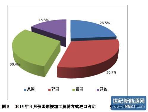 按贸易方式来分,2015 年 4 月份我国一般贸易方式进口多晶硅为 4753 吨,占比为 43.6%,加工贸易等方式进口 6144 吨,占比为 56.4%。分国别具体看来:4月份自韩国按加工贸易方式进口多晶硅1887吨,占自韩国进口总量的49.7%;