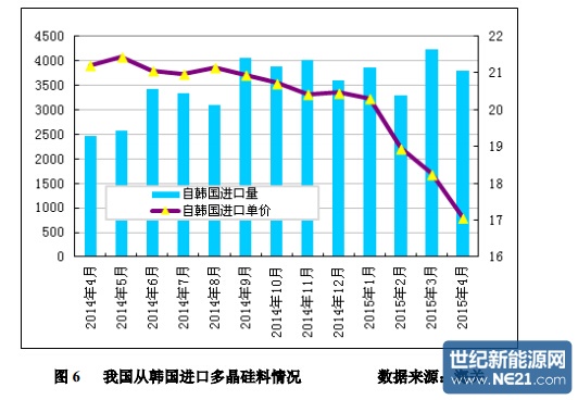 2015 年 4 月份从韩国进口多晶硅量减至 3796 吨,环比降幅为 10.1%;4 月份进口单价小幅下滑至 17.07 美元/千克,环比降幅为 6.6%。