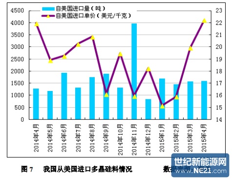 2015 年 4 月份从美国进口多晶硅量为 1584 吨,环比增幅为 7.6%;4 月份进口单价微幅上调至 22.23 美元/千克,环比涨幅为 11.5%。