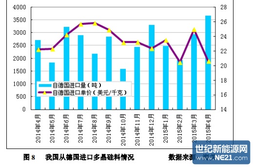2015 年 4 月份从德国进口多晶硅量增加至 3667 吨,环比大幅增幅为 24.8%;4 月份进口单价下滑至 20.62 美元/千克,环比跌幅为 17.4%。