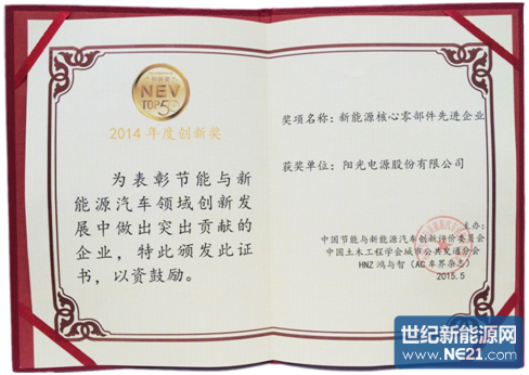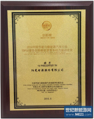 “NEV TOP50”以“总结创新成果,树立创新标杆,驱动产业化发展”为目标,是新能源汽车行业唯一的创新指数榜。凭借良好的市场口碑和卓越的创新技术,阳光电源电动车控制器系列产品再次在众多参评产品中脱颖而出,公司被评为“新能源核心零部件先进企业”和 “最佳创新新能源客车动力驱动企业”。这是阳光电源电动车控制器产业继去年获得国家设计奥斯卡奖——“红星奖”之后赢得的又一项殊荣。
