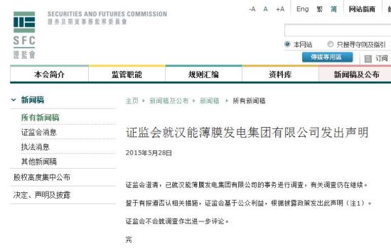 原标题:香港证监会:已就汉能薄膜发电进行调查
