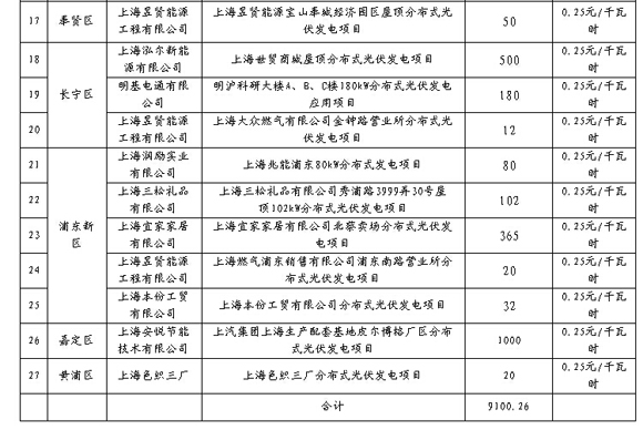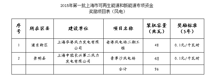 根据《上海市可再生能源和新能源发展专项资金扶持办法》(沪发改能源〔2014〕87号,以下简称《扶持办法》),市发展改革委会同相关部门和单位,组织开展了2015年第一批可再生能源和新能源发展专项资金扶持项目的申报和评审工作。在专家评审意见的基础上,经审核,青草沙等2个风电项目(共96兆瓦)、上海西华国际学校等27个分布式光伏项目(共9100.26千瓦)和389户个人光伏(共2097.049千瓦)符合条件,拟列入市可再生能源和新能源发展专项资金奖励目录予以支持(详见附表)。