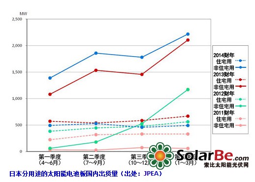 2014财年住宅领域和非住宅领域的日本出货量分别为1.97GW和7.24GW。上财年这两个领域的出货量分别为2.36GW和6.17GW,因此住宅领域虽减少了16.5%,但非住宅领域增加了17.3%。可知非住宅领域的增长推动了整体的增长。住宅领域的出货量减少,有随着消费税的上涨,住宅的开工建设数量减少等原因。