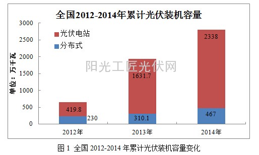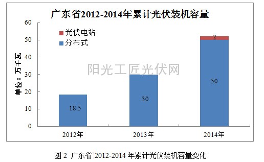 表2和图1、2展示了2012-2014年间广东省和全国光伏装机容量数据以及攀升趋势。