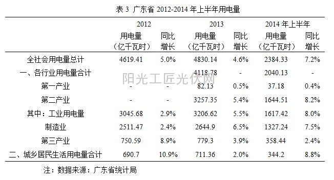 由表3和图3的数据可知,2012-2014年广东省全社会用电量和工业用电量均呈逐年增长趋势,且工业用电量的同比增长率也呈上升趋势。根据2014年上半年广东省工业用电量预测2014年全年工业用电量约为3289.3344亿千瓦时,假设其中的10%是光伏电,那么需要约32GWp装机容量的光伏电站供电,而目前广东省累计光伏装机容量仅不足1GWp,由此可以看出,广东省大型并网光伏电站具有巨大的发展潜力。