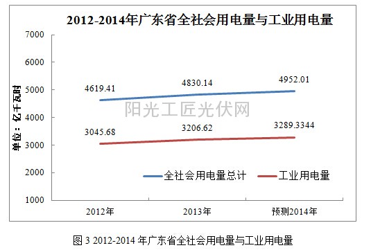 前文已经提到广东省的光伏电站以大型屋顶电站为主,且多建于工厂厂房屋顶,因此,工业用电量将影响大型屋顶光伏电站的建设和发展。下面将分析广东省2012-2014年全社会用电量与工业用电量的变化趋势。详见图3。