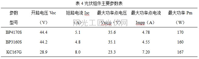 本系统共采用了三种型号的光伏组件,分别是:BP太阳能公司生产的单晶硅光伏组件BP4170S、多晶硅光伏组件BP3160S以及日本京瓷公司生产的多晶硅光伏组件KC167G。所采用的并网逆变器也分为3种型号:SC125LV、SC90以及SB2500(额定功率分别为125kW、90kW和2.5kW)。其中,SC125LV和SC90为集中式逆变器,SB2500为组串式逆变器,以上3种型号的并网逆变器均由德国SMA公司生产。3种光伏组件的主要参数如表4所示。
