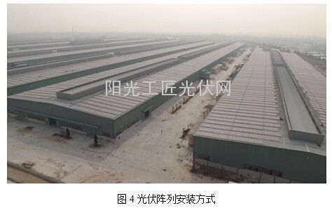 本项目为屋面光伏电站,其中彩钢瓦屋面占主体,均采用沿屋面平铺,屋面原倾斜角在2°左右。下图4所示为本项目完工后的光伏阵列实际情形。