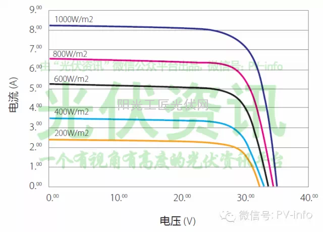 光伏组件只有在STC条件(辐照强度是1000W/m2、温度25℃、大气压为1.5AM)时,出力才是标称功率,辐照度降低,输出功率也会降低,如下图。