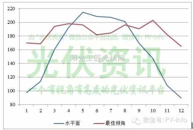 上图为水平面、最佳倾角时的月总辐射量数值。可以看出,