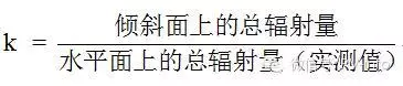 条件三:倾斜面上辐射量与水平面上辐射量比值,夏至日K=0.873,全年平均K=1.171,冬至日K=1.857,秋分日K=1.382。