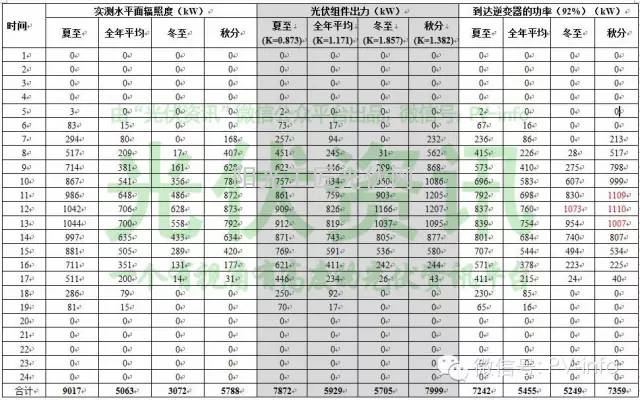 从上表可以看出,虽然夏至日的太阳能资源最好,但由于支架倾角的原因,秋分日光伏组件出力最好。