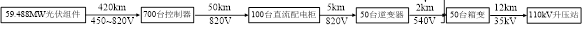 集散式每个发电单元设计方案为:光伏组串所发电量用PV1-F-1×4电缆汇入14台控制器(12个16进1出,2个8进1出),再以820V的直流电压用ZR-YJY22-0.6/1-2×50电缆汇入2台直流配电柜,之后以820V的直流电压用ZR-YJY22-0.6/1-2×50电缆汇流进入1台1000kW逆变器,转化为540V的交流电后,用ZR-YJY22-0.6/1-3×185汇入一台1000kVA的箱式变压器。