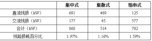 由于线缆长度的差异,造成线损的差异,从而造成MPPT电压差异。由于集散式、组串式都能在组串段,对每个组串的MPPT进行精确跟踪,因此,此项损失暂不考虑;而传统的集中式逆变器,由于每个发电单元仅有2路MPPT,因此要按电压最低的组串考虑(即离逆变器最远的组串)。经计算,集中式由于MPPT电压跟踪造成的损失按150kW考虑,约为0.34%。