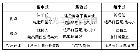 本文通过对典型光伏项目的“初始投资”和“PR值”两项的对比,分析了逆变器选型对LCOE的影响,发现三种逆变器的优缺点如下表。