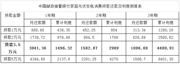 3,家庭光伏发电信用消费贷款的最低利率为贷款同档次基准利率上浮20%。该利率视贷款期限的不同而不同,贷款期限在一年以内(含一年)的为固定利率,合同有效期内如遇基准利率调整,仍按贷款合同约定的利率执行;一年以上的贷款采取浮动利